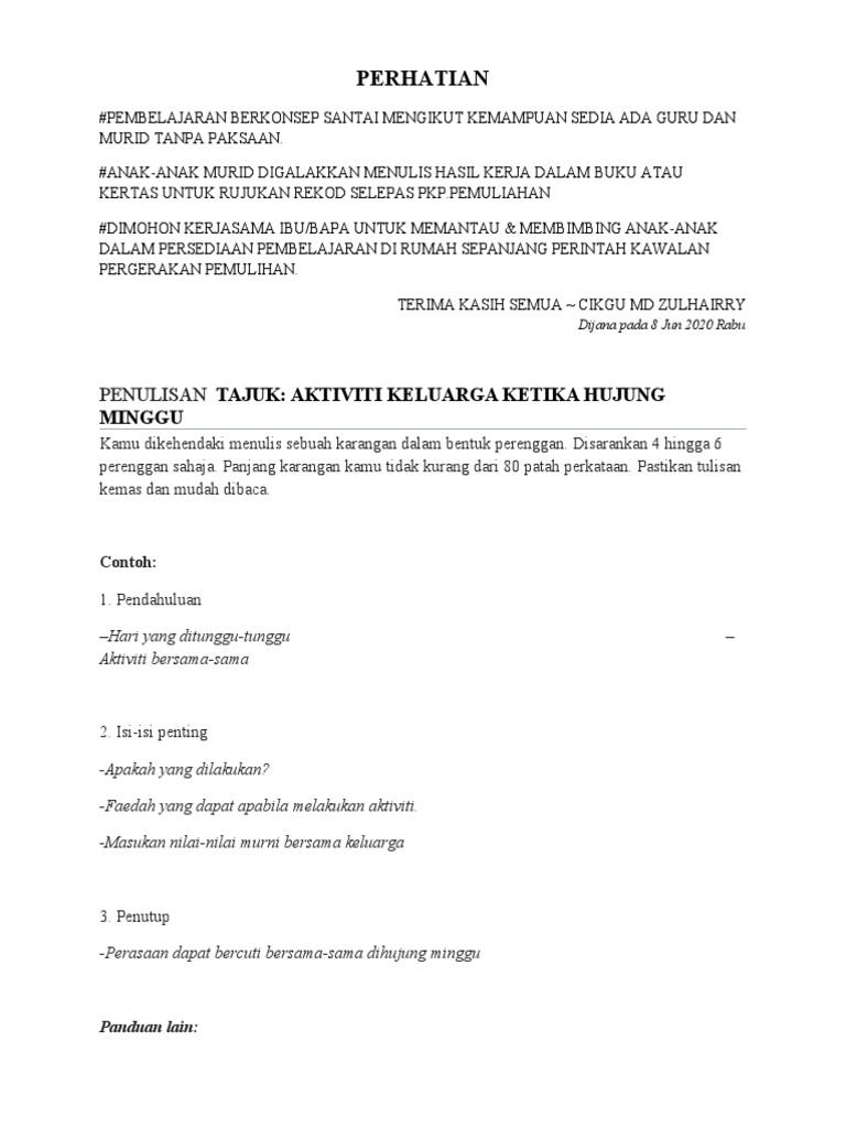 Penulisan Karangan Aktiviti Bersama Keluarga Di Hujung Minggu Murid