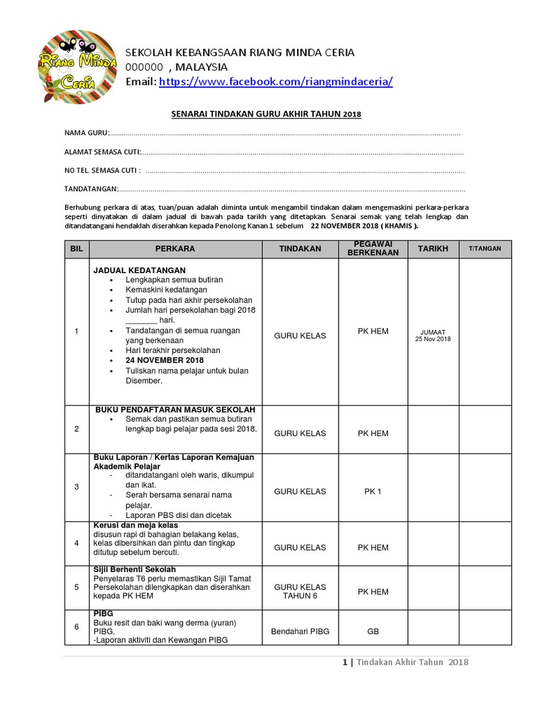 Pengumuman itu pada hemat beliau sebenarnya tidak membawa apa-apa kesan yang besar pada keadaan murid-murid guru-guru dan ibubapa. PEMBENTANGAN KERTAS KERJA LAPORAN 41 Persediaan Mengajar 411 Pengerusi memaklumkan bahawa guru perlulah melengkapkan Rancangan Pengajaran Harian dalam Buku Rekod mengikut format yang telah ditetapkan untuk dihantar pada hujung tahun 2017. Sistem sekolah di Malaysia bagi sekolah rendah mahupun sekolah menengah akan berakhir pada hujung tahun iaitu sekitar bulan november atau disember setiap tahun.